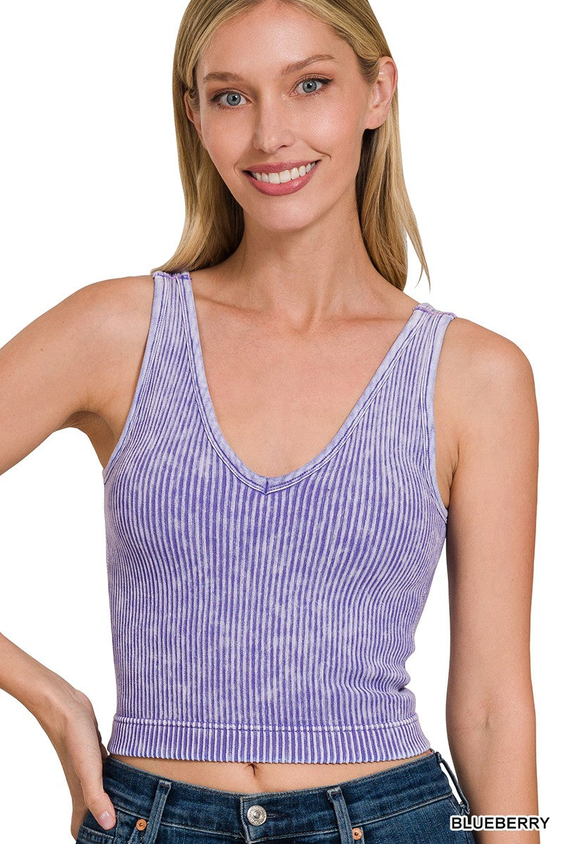 Experience comfort and style with our Blueberry Mineral Wash Ribbed Seamless Padded Bralette V Neck Tank Top. Perfect for the heat, this on-trend top is so comfortable you'll want to wear it all the time. Stay cool and look great with this must-have addition to your wardrobe!
